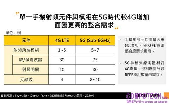 根據DIGITIMES Research分析師陳澤嘉觀察,伴隨5G通訊邁入商轉階段,智慧型手機支援5G、4G及以下通訊技術時,天線(antenna)與射頻前端(Radio Frequency Front End;RFFE)模組用量將較現行4G通訊約倍增,在手機內部空間受限下,RFFE模組需要更高的整合度,3D封裝、雙面(double side)、系統級封裝(System in Package;SiP)與天線封裝(Antenna in Package;AiP)成5G射頻元件異質整合(Heterogeneous Integration;HI)關鍵技術。