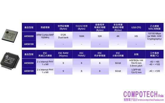 亞信電子(ASIX Electronics Corporation)因應全球工業4.0智慧生產自動化的強大需求,於2018年推出大中華地區首款EtherCAT從站控制晶片「AX58100 2/3埠EtherCAT從站控制器」,並於2019年再度推出最新一代小封裝並整合兩個高速乙太網路PHY的EtherCAT從站專用通訊SoC解決方案「AX58200 2/3埠EtherCAT從站專用通訊SoC」,提供企業轉化到智慧工廠生產自動化的最佳解決方案。AX58x00系列EtherCAT從站晶片提供客戶一個簡單設計、經濟有效的工業乙太網路EtherCAT從站解決方案。可適用於各種實時現場總線產品應用,如馬達/運動控制,數位訊號I/O控制,感測器數據採集,工業機器人轉軸控制,EtherCAT IO-Link主站,EtherCAT Junction從站模組等。