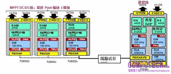 • 快速串行接口(FSI)以高達 200 MBPS 的速度實現可靠且強大的高速傳輸晶片(chip-to-chip)或板對板(board-to-board)通訊。與其他接口(如 CAN 或 SCI)相比,FSI 更具優勢。CAN 與 SCI 的速度慢且不提供偏移補償(Skew compensation),並不適合作為連接多個MCU跨隔離通訊的解決方案。由於 FSI 固有的偏移補償(Skew compensation)功能和速度,連接多個 MCU 以獲得資源可擴展性成為一種省力且穩健的接口選項。圖 1 所示為如何利用 FSI 來實現多個即時控制 MCU 的連接,使得可擴展 MIPS、PWM 和 ADC 可用於太陽能逆變器和其他應用中。
