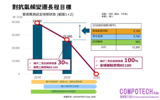 新的長程目標是根據2018年全球碳排 (範圍1 + 2:37,380噸-CO2) 數據所制定。愛德萬測試預計在2030年底前減碳30%,並在群馬廠區導入再生能源,實現RE100倡議。該公司的終極目標是在2050年達到零碳排,並在全球據點實踐RE100倡議。