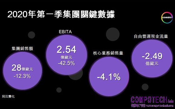 儘管市場環境深受疫情影響,科思創仍達成2020年第一季的稅前息前折舊前攤銷前利潤(EBITDA)目標。第一季核心業務銷售量同比下降4.1%,主要是由於2020年2至3月,新型冠狀病毒疫情的持續擴散,對位於中國的客戶之生產運作造成了影響,導致中國市場需求明顯疲軟。此外,加上聚氨酯和聚碳酸酯事業體的市場競爭加劇,全球銷售價格下降,導致集團銷售總額降低12.3%,至28億歐元。EBITDA符合第一季財務預期,下降42.5%至2.54億歐元。稅後淨利則下降88.8%,為2000萬歐元(–)。自由營運現金流量(FOCF)如預期,達負2.49億歐元。