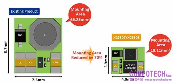 XC9307 / XC9308系列是負電壓輸出DC /DC轉換器,採用1.8 x 2.0 x 0.4mm的小型薄型封裝。 (圖1和2)開關頻率提高至2.5MHz,可以使用包含所需電感和電容器在內,高度低於0.65mm的零部件。與普通負電壓輸出的DC/DC轉換器相比,本系列產品的安裝面積減少約70%(從65.25mm2到19.11mm2),為減小電子設備的尺寸與薄型化做出貢獻。 (圖3)