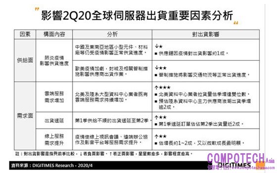 根據DIGITIMES Research分析師龔明德統計與分析,因肺炎疫情從中國大陸蔓延至全球,相關封城管制措施使供貨進度受阻,2020年第1季全球伺服器出貨表現低於2月所做預期,從原預估季減9.8%進一步下修至季減16.9%,為365萬台。展望第2季,因既有雲端服務需求攀升、第1季因斷鏈造成供貨遞延,以及疫情反使線上服務、遠端辦公協作等需求劇增,加上第1季基期較低等因素,預估第2季全球伺服器出貨量可望季增15.8%。