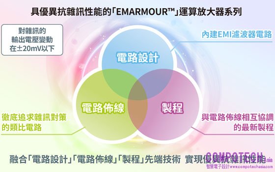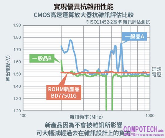 「EMARMOUR」是ROHM產品的品牌名稱,融合了ROHM「電路設計」「電路佈線」「製程」等先端技術優勢所研發而成。在ISO11452-2的國際抗雜訊評估測試中,從各種雜訊頻段的輸出電壓波動部份來看,評測結果平均在±300mV以內,擁有十分優異的抗雜訊性能。由於抗雜訊性能出色,不僅有助於解決系統研發過程中雜訊干擾的問題,同時也能有效減少設計時程,並提高可靠性。