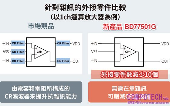 新產品的抗雜訊性能非常優異,可減少普通產品所必需的外接降噪零件(電源、輸入、輸出的CR濾波器)數量。以ROHM的1ch運算放大器為例,與普通產品相比,共可減少10個降噪零件。