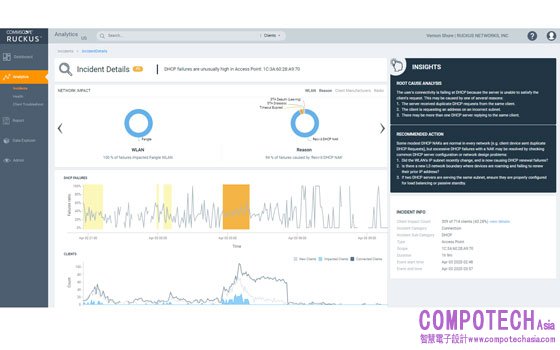 機器學習與人工智慧 - RUCKUS Analytics中的Incident Analytics模組提供IT快速回應問題的工具,以防止異常問題升高到影響服務品質的程度。