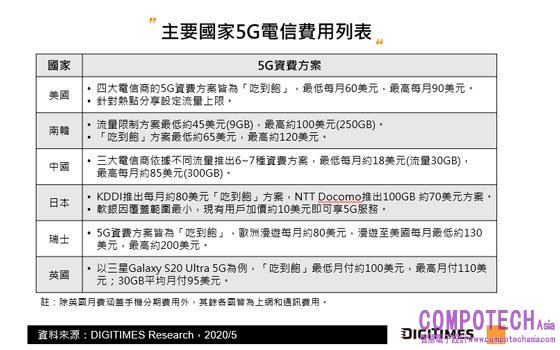 就推出5G服務的主要國家而言,5G每月電信費多介於50至100美元間,若再加上5G手機每月約35~60美元的分期,整體5G相關月均支出至少為85美元。