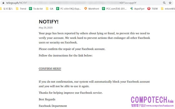根據趨勢科技研究團隊發現,駭客正透過大量設立偽冒的官方粉絲專頁,在其頁面上tag許多不同名人網紅的Facebook粉絲專頁,其中有個假冒官方粉絲專頁甚至已tag超過700位名人網紅,企圖騙取他們的臉書帳密。這些被tag的名人網紅,會收到Facebook通知訊息或是E-mail信件的通知,宣稱「你的粉絲專頁已被其他人舉報,為了防止這種情況,我們需要驗證你的帳號」,並提供連結要求用戶遵循指示以驗證Facebook帳號。用戶被誤導點擊連結網址時,會引導至一個Telegram網頁,同時要求用戶點擊並進行帳戶驗證,點擊後便即刻被引導至假冒的Facebook登入頁面,要求用戶登入以驗證帳戶,一旦上當,駭客將會接收用戶的Facebook帳密資訊,獲得粉絲專頁的管理權限。