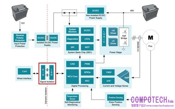 圖二:數位隔離器保護48-V HVAC壓縮器模組的低電壓側