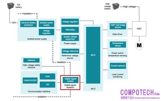其他應用也可能因數位隔離器溫度等級較高而受益,如48-V混合動力汽車的水泵浦、冷卻風扇、煤煙感測器、牽引逆變器等。多數系統使用數位隔離器,搭配收發器(大多為CAN、CAN FD或區域互聯網路 [LIN] 通訊協定)做為通訊介面。圖二為暖通空調(HVAC)壓縮器模組,使用隔離器做為通訊,從高電壓側的MCU傳輸至低電壓側的通訊介面板。