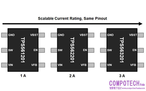 所謂具規模彈性的系列裝置,意指各裝置的針腳對針腳相容,且系列中每項裝置接腳相同,如圖一所示,換言之,若要將 10A 額定裝置更換為 20A 額定裝置,只需移除 10A 裝置,再裝上 20A 裝置,不需以侵入性方式大幅更動電路板配置;亦可繼續運用同系列裝置的各項特色,如外部零組件數量少、可堆疊與 PMBus協定等。總而言之,系列產品如具規模彈性,可服務更多樣的應用,而非僅限一、兩種。