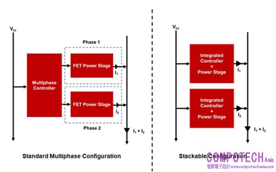 相較於單一晶片,可堆疊架構的熱能可藉由多個裝置分散,故可提升熱耗散效果;且單一晶片中,較低額定電感成本低於較高額定電感,可堆疊設計亦可降低零組件成本。此外,設計師可於單一堆疊內混用具規模彈性的系列產品,以滿足電流需求,可互換特質也能更有效率地處理負載點需求。