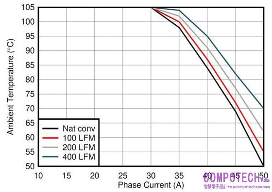 欲瞭解電源供應的真正運作範圍,除了可參考效能或功率損耗曲線,也應對照安全工作區(SOA)曲線, TPS546D24A 的曲線如圖二所示,根據轉換器運作時的環境溫度,可透過 SOA 曲線,瞭解轉換器在運作期間實際可提供的功率級數。