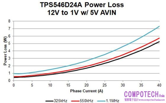 判斷轉換器功率額定是否符合應用需求的標準眾多,但可先釐清轉換器使用前的功率損耗情況,圖一為 40-A 輸出電流額定降壓轉換器 TPS546D24A 的功率損耗曲線,由於此轉換器的接地點面積墊 (ground pad)較大,整合型場效電晶體 RDS(on) 較低,即使在輸出電流高的狀況下,功率損耗亦相對低。因此,審慎考量裝置設計負載條件下的功率損耗,才得以確保轉換器在適當的額定功率,符合應用的熱能環境。