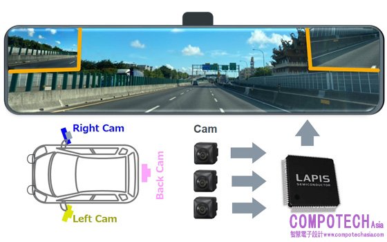 「此次開發的 ADAS E-Mirror,為第一款把 ADAS 功能加進 E-Mirror 的產品,可以加強對於駕駛安全的輔助。此 E-Mirror 最多可以同時顯示三個鏡頭的畫面,大大降低車輛盲區,增進行車安全。運用 LAPIS ML86321 晶片可提升畫質解析度達到 FULL HD 1920x1080P (鏡頭輸入), 相較於目前坊間 1280x720P 的產品,在畫面的清晰度上獲得很大的提升。」