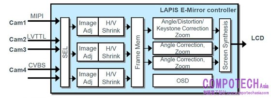 此 ADAS E-Mirror 解決方案包括 ROHM 集團 LAPIS 的影像顯示控制器 ML86321,可支持 3 鏡頭的合成&圖像校正功能(角度/翹曲校正/梯形失真校正/鏡頭失真校正)和 OSD,ROM-OSD 功能和狀態監控功能,同時結合偉詮電子的 ADAS (WT8911)提供 MOV (Motion Objective)功能,可於車輛倒車(泊車)時提供輔助應用。