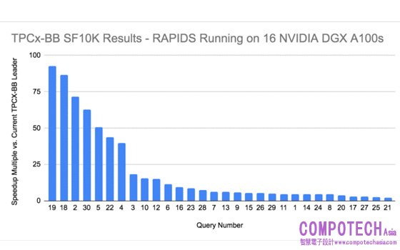 儘管分散式運算系統不斷穩定進步著,但在 CPU 上進行這類大數據分析工作仍會遇到瓶頸。在 DGX A100 上使用 RAPIDS 進行分析的結果,象徵著第一個在 GPU 上進行的非正式 TPCx-BB 基準,而這項測試基準過去只在 CPU 系統上運行。