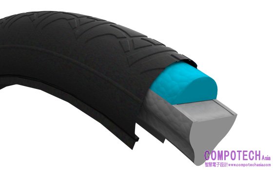 Air Fom目前正將特色技術與創新材料相結合,藉由泡棉顆粒鑄造技術,將熱塑性聚氨酯發泡材料模製成特定形狀並於輪圈上精準地呈現材料的卓越性能。而此款無氣輪胎與充氣輪胎一樣輕巧、富有彈性,並可快速且牢固地安裝在標準輪圈上;此款採用科思創材料製成的無氣輪胎與傳統輪胎中使用的丁基橡膠管不同,不僅無須維修保養,更重要的是可回收再利用。此外,該材料解決方案亦可確保自行車租賃公司的車輛維持營運狀態。
