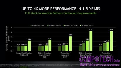 這些在不到兩年所獲得的效能提升,憑藉的是 AI 平台各領域的創新。當今的 NVIDIA A100 GPU 結合 CUDA-X 函式庫的軟體更新,為透過 Mellanox HDR 200Gb/s InfiniBand 連網技術打造的擴充叢集系統提供支援。