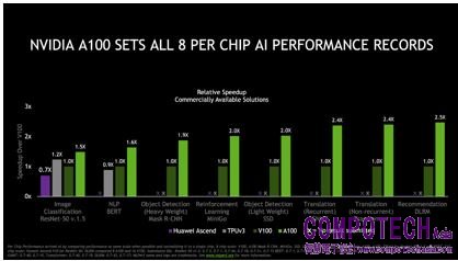 圖三: NVIDIA Ampere 架構席捲所有市售加速器產品的 8 項測試