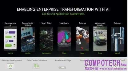 這些框架是針對汽車 (NVIDIA DRIVE)、醫療 (Clara)、機器人 (Isaac) 以及零售/ 智慧城市 (Metropolis) 等市場中,不斷成長的應用程式框架的一部分。