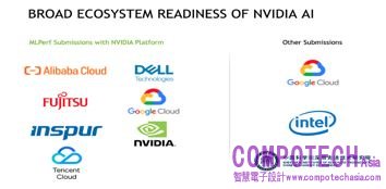 提交測試成果的九家公司中,有七家採用 NVIDIA GPU,包含雲端服務供應商如阿里巴巴、Google、騰訊,以及伺服器製造商如戴爾科技、富士通、浪潮集團,顯示出 NVIDIA 生態系合作夥伴的優勢。