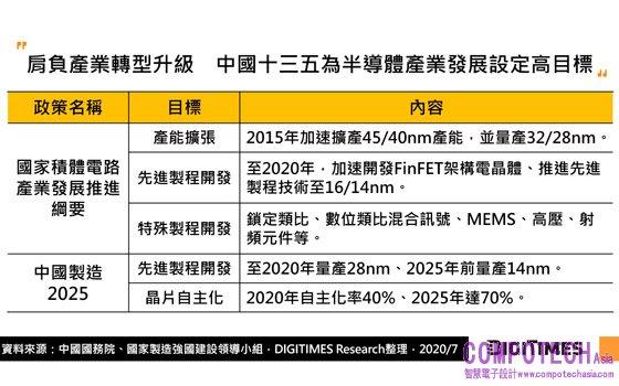 展望十四五時期,DIGITIMES Research分析師陳澤嘉認為,中美貿易戰延燒將促使中國更致力推動半導體自主化發展,包含運用國家集成電路產業投資基金(簡稱大基金)挹注產業資源,以發展7奈米製程與特殊製程,5奈米製程技術進展則視中美貿易戰走向。另外,中國IC製造月產能目標也擴充至100萬片12吋約當晶圓,較十三五時期明顯成長。