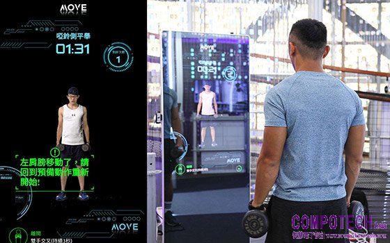 「智慧健身鏡」內存豐富的教練標準動作影片庫,使用者選擇欲鍛練的部位,播放教練標準動作影片,讓使用者跟著影片運動,同時系統會偵測使用者身體主要節點,例如:頭、頸、肩、肘、臀、膝等,藉由肢體動作資訊結合教練專家知識,即時指導訓練動作是否正確,避免造成任何的運動傷害。目前先行推出智慧啞鈴重訓指導,後續將延伸至彈力帶、兒童體操等徒手運動項目。