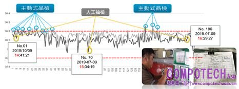 圖說:資策會創生處開發「品質預測與主動品檢技術」,圖為實際運作數據畫面,人工定時抽檢,無抽驗到瑕疵品,透過品質預測與主動品檢技術,預測瑕疵品的工件,NG檢出率高達78.33%。