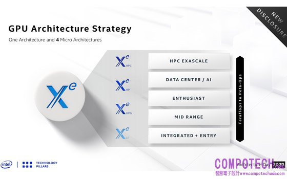 • 英特爾推出Xe微架構新版本Xe-HPG,這是一款為遊戲最佳化的微架構,結合Xe-LP良好的效能/功耗元素,加上Xe-HP的規模優勢加大組態,並從Xe-HPC最佳化運算頻率。為提升每單位成本的效能,加入基於GDDR6的新記憶體子系統,且Xe-HPG將支援光線追蹤加速功能。Xe-HPG預計於2021年開始出貨。