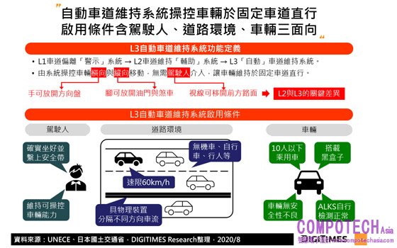 DIGITIMES Research歸納L3自動車道維持系統關鍵技術與產品包含人機互動介面(Human Machine Interface;HMI)、高精度地圖、環境感測器、車聯網等四項,國際車廠如本田(Honda)、凌志(Lexus)、賓士(Mercedes-Benz)、寶馬(BMW)等皆預計推出L3車款,將有助相關技術與產品加快落地商轉。