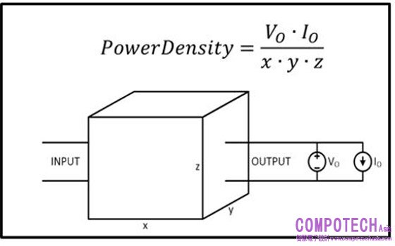 對於電源管理應用而言,功率密度的定義似乎不複雜:這是轉換器的額定 (或標稱) 輸出功率除以轉換器佔用的體積,如圖 1 所示。