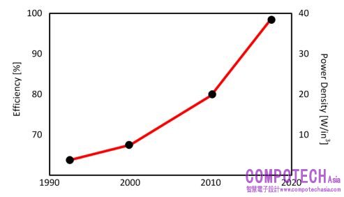 自從 1990 年代初期以來,由於個人運算、電子、電信和半導體技術日新月異,對於提高效率的需求大幅激增。電源解決方案效率提高也促進功率密度持續提高,如圖 2 所示。