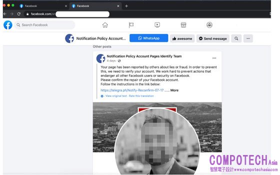 一旦訊息或貼文內包含外部連結,請立即向Facebook舉報該頁面。