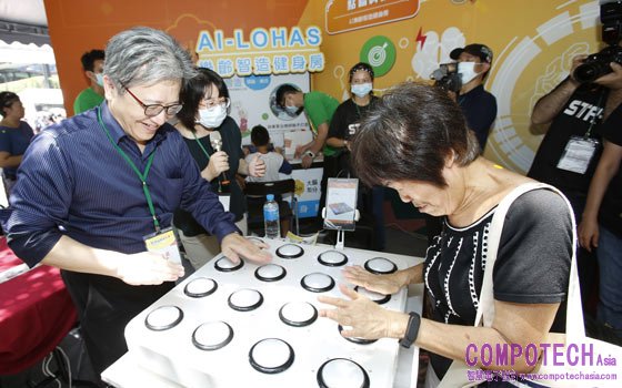 圖說:行政院科技會報辦公室蔡志宏執秘(圖左)於智慧城鄉嘉年華活動中,體驗智慧城鄉健康服務。