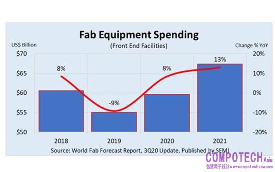 2020年9月9日--SEMI國際半導體產業協會今(9)日公布的最新全球晶圓廠預測報告(World Fab Forecast),晶片需求在新冠病毒影響下持續激增,用於通訊和IT基礎設施以及個人和雲端運算、遊戲和醫療電子裝置等各種產品,全球晶圓廠設備支出因此受惠,2020年增幅預估達8%,2021年更將成長13%,見下圖。今年的市況,隨著資料中心基礎設施和伺服器存儲需求增加,加上新冠疫情以及中美貿易戰加劇,供應鏈預留安全庫存,是帶動今年大幅增長的主要因素。