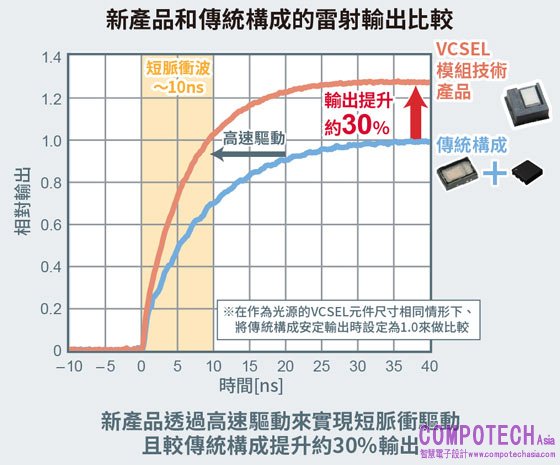 本次,ROHM將新VCSEL元件和MOSFET元件集中於單一模組封裝中,縮短元件間佈線長度,可充分發揮各元件 的性能,若使用不易受到陽光等外部干擾的光源短脈衝(10nS以內)來驅動,輸出功率也比傳統產品提升約30%。