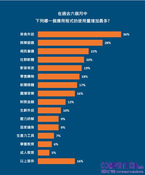 此外,美食外送(36%)、手遊(28%)和視訊會議(22%)App使用量大增;其中在零售購物的變化最為顯著:美食外送 (44%)、零售購物 (37%)、生鮮雜貨外送 (35%) App使用頻率亦大幅提升,成為台灣消費者在疫情間最常使用的應用程式。