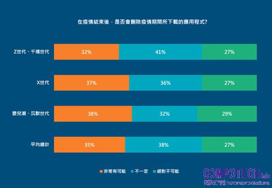 台灣地區消費者在考慮是否要下載新的App時,相當重視周遭親友推薦;41% 會依據親友同事的推薦而下載。此外,投放廣告也是推廣App的重要管道;57%(在Z世代和千禧世代比例為44%)表示,曾因為社群媒體、電視或其他App內的廣告,在疫情期間下載新的App。