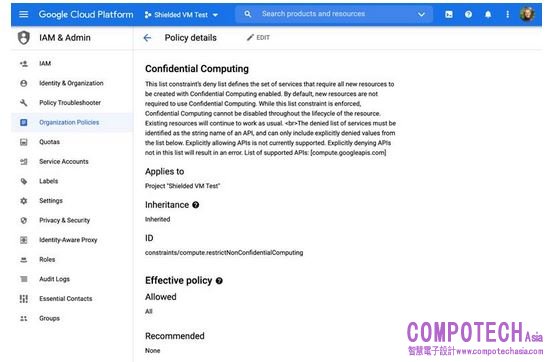 2. 全新的機密運算資源政策控管機制。你現在可以設定用於身分與存取權管理的機構政策( IAM Org Policy),藉此定義機密 VM 專屬的存取權限。另外,你也能停用在專案中運作的任何非機密 VM。套用這項政策之後,任何嘗試在該項專案中啟動非機密 VM 的動作都會失敗。隨著搭載機密運算技術的服務日漸增加,只要你善用這些身分與存取權管理政策,就能輕鬆控管要在專案、資料夾或機構中啟用哪些機密運算資源。