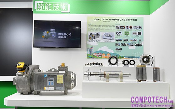 在「永續發展館」節能科技領域,展出了技術產化的磁浮離心壓縮機,由於臺灣地區氣候炎熱使得空調用電占比較高,尤其冰水機又占了中央空調總耗電量50%,對尖峰與全年度用電量影響甚鉅。在經濟部能源局支持下,工研院打造高效率磁浮離心式冰水機,能源效率比國際競爭標竿商品高出10%,為市場上同級產品中效率之冠的機種。其無油、靜音、低振動、遠端監控、重量輕、體積⼩的六大優點,全年省電效率較傳統冰水機提升3至4成,以一台製冷能力為200RT的離心式冰水機為例,每台每年的節電量約可達3.3萬度。
