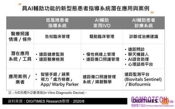 根據DIGITIMES Research分析師杜爭璟觀察,醫療人工智慧(Medical Artificial Intelligent;Medical AI)將建立以醫療資訊源自患者的創新遠距醫療(Telehealth)模式,以應用於低風險患者指導系統、AI輔助使用的家用體外診斷儀器,告知或驅動臨床管理,進而執行診斷或提供治療建議,基此,遠距醫療AI化可望加速遠距照護/醫療的臨床服務與應用落地。