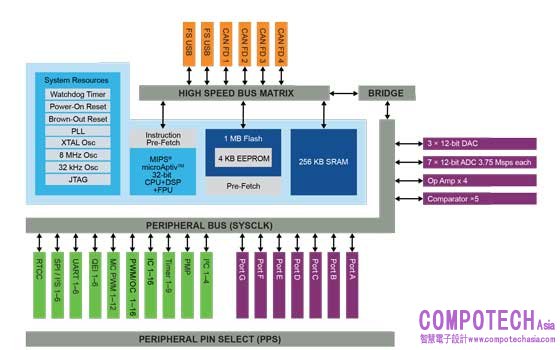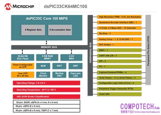 dsPIC33CK64MC105 DSC提供6種封裝,小至4 x 4 mm,接腳數從28到48,每10,000個的起售單價為1.13美元,記憶體範圍從32KB到64KB Flash,內建8KB RAM。 PIC32MK元件的接腳數從48至100,每10,000個的起售單價為3.27美元,記憶體的容量從256KB到1MB flash,以及從64KB到256KB的 RAM。