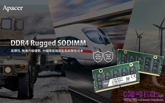 全球工控記憶體領導品牌Apacer宇瞻科技(8271)發表強固型DDR4 Rugged SODIMM抗震記憶體,鎖定在震動環境下的軍工產業應用需求,助力5G基地台、能源探勘、風力發電、航太國防、鐵路與交通運輸等工控垂直市場無痛升級強固型應用。宇瞻DDR4 Rugged SODIMM符合JEDEC DDR4 SODIMM工業標準規格,可兼容於現有的主板,大幅降低強固型系統開發成本、進而提升產品價格競爭力。