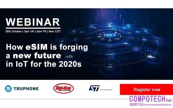 2020年10月23日--全球領先的電子元件經銷商 Digi-Key Electronics 宣佈,將與 STMicroelectronics 和 Truphone 共同贊助一場產品培訓網路研討會,專門探討 eSIM 如何開創 IoT 嶄新的未來。這場網路研討會將於中港台時間 10 月 28 日晚間 10 點舉行(英国時間上午 9 點)。
