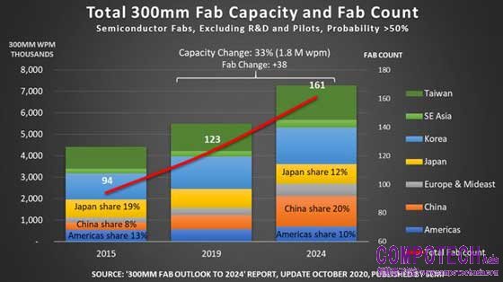 中國佔全球12吋晶圓產能的比重持續快速增加,將從2015年的8%躍至2024年的20%,預計在報告涵蓋的最後一年,即2024年達到每月150萬片(wpm)。儘管非中國公司在這一波增長中佔了很大一部分,不過中國旗下企業組織正在加速產能投資,相關企業2020年佔中國晶圓廠產能43%左右,預計2022年將達到50%,2024更將爬升至60%。