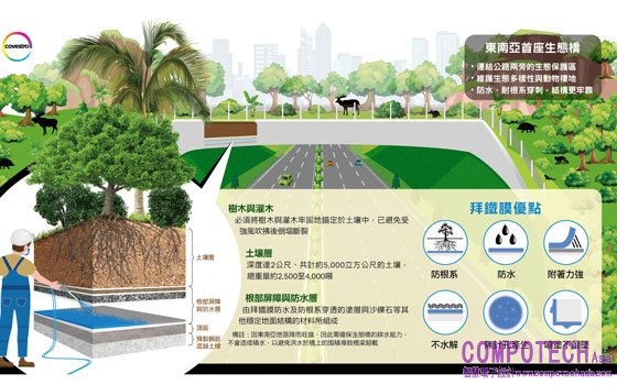 易兆企業總經理楊木榮表示:「城市發展與生態多樣性缺一不可,但如何在有限的土地上同時達到生態保育的目的,則需要仰賴創新的構思與合作夥伴的材料技術支援。我們很高興能發揮拜鐵膜技術優異的耐根系與防水特色,一同建造耐久可靠的生態廊道,為陸上動物保育盡一份心力。」