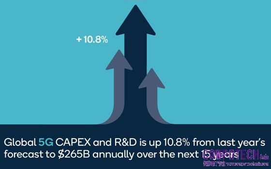 • 在5G資本支出與研發經費方面,美國與中國將處於領先地位,在這份研究報告中所涵蓋的15年期間裡,將分別投入1.3 兆與1.7兆美元。