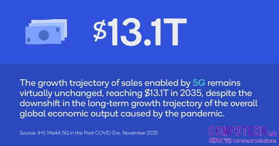 • 到2035年,5G 將促使全球銷售額實現高達 $13.1兆美元的規模