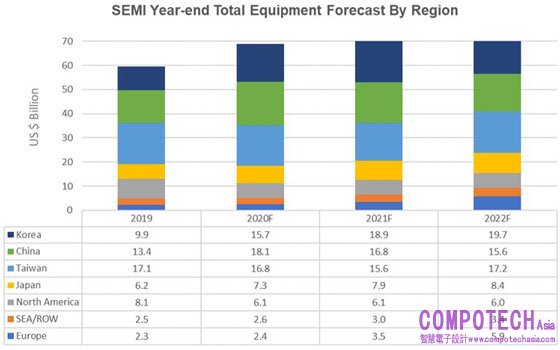 以地區來看,大陸、台灣地區和韓國都是2020年設備支出金額的領先集團。中國在晶圓代工和記憶體部門投資持續挹注下,今年將首次於整體半導體設備市場中躍居首位;韓國則在記憶體投資復甦和邏輯投資增加推波助瀾之下,可望在2021年領先全球;台灣地區得益於先進邏輯晶圓代工的持續投資,設備支出依舊強勁。這份報告也看好其他地區在未來兩年也將有所成長。